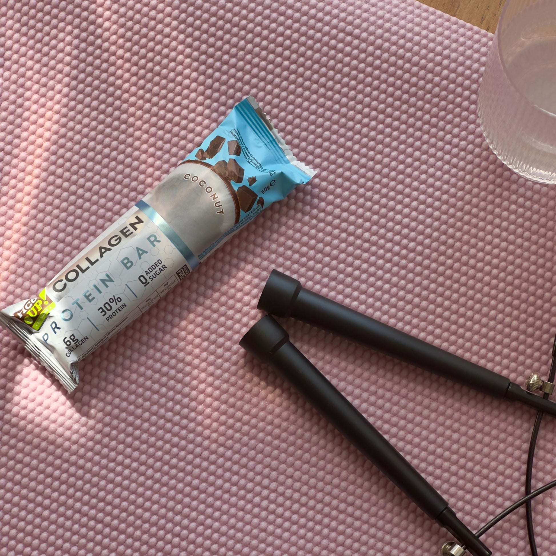 RiceUP! Колагенов бар е ново поколение функционален десерт, който не прави компромис с вкуса и се побира в под 215 калории, което го прави идеалният снакс за тези, които следят калорийния си прием, той една вълшебна комбинация от текстури, вкус и функционалност, която обещава наслада с всяка хапка! Съчетава нежен протеинов пълнеж с екзотичен вкус на кокос, слой кокосов крем, без добавена захар и фини какаови криспита, обвити в истински млечен шоколад, без палмова мазнина. Колагеновият бар съдържа 6000mg хидролизиран телешки колаген тип I и III. Колагенът е ключовият компонент в RiceUP! Collagen Protein Bar. Основни свойства на колаген тип I и III са: