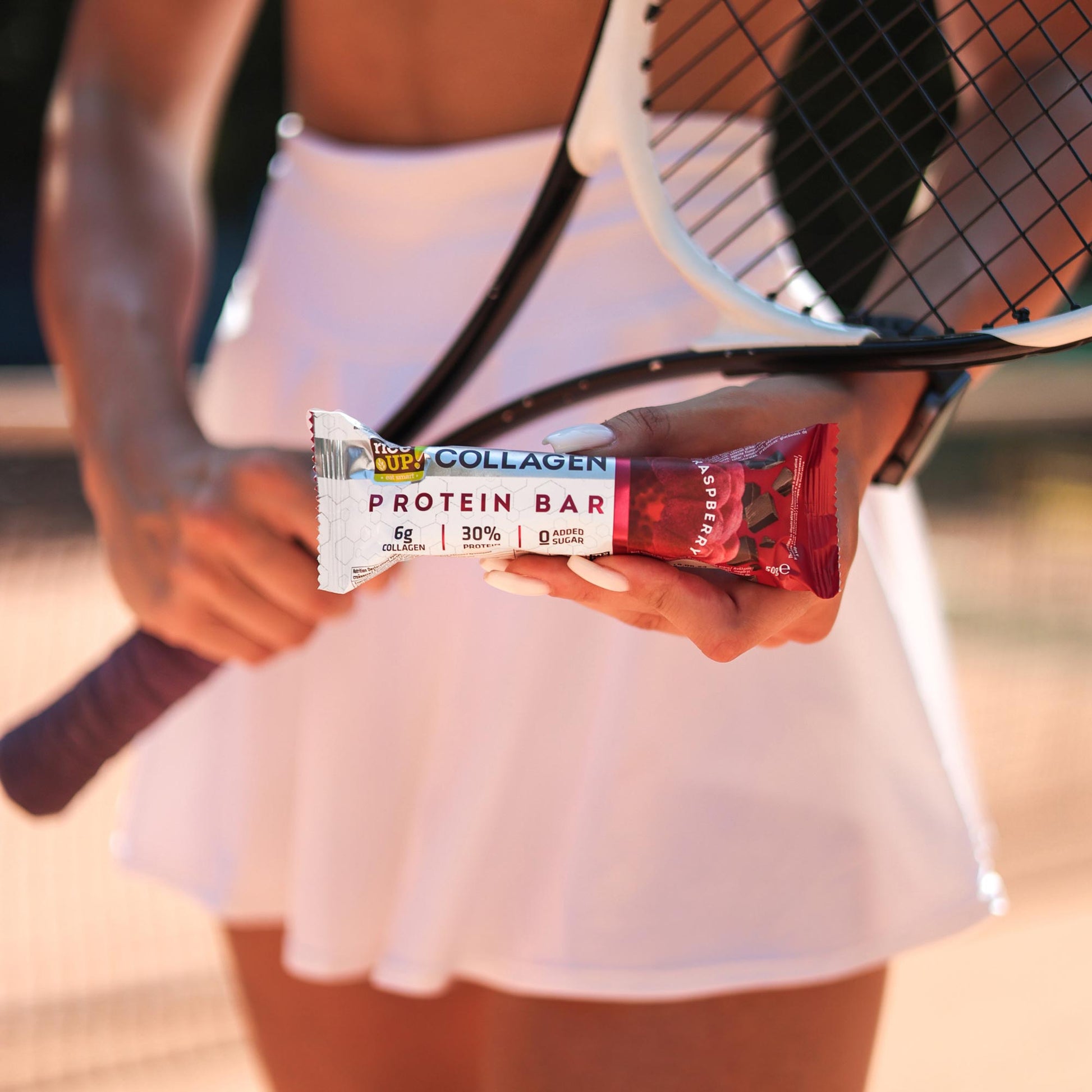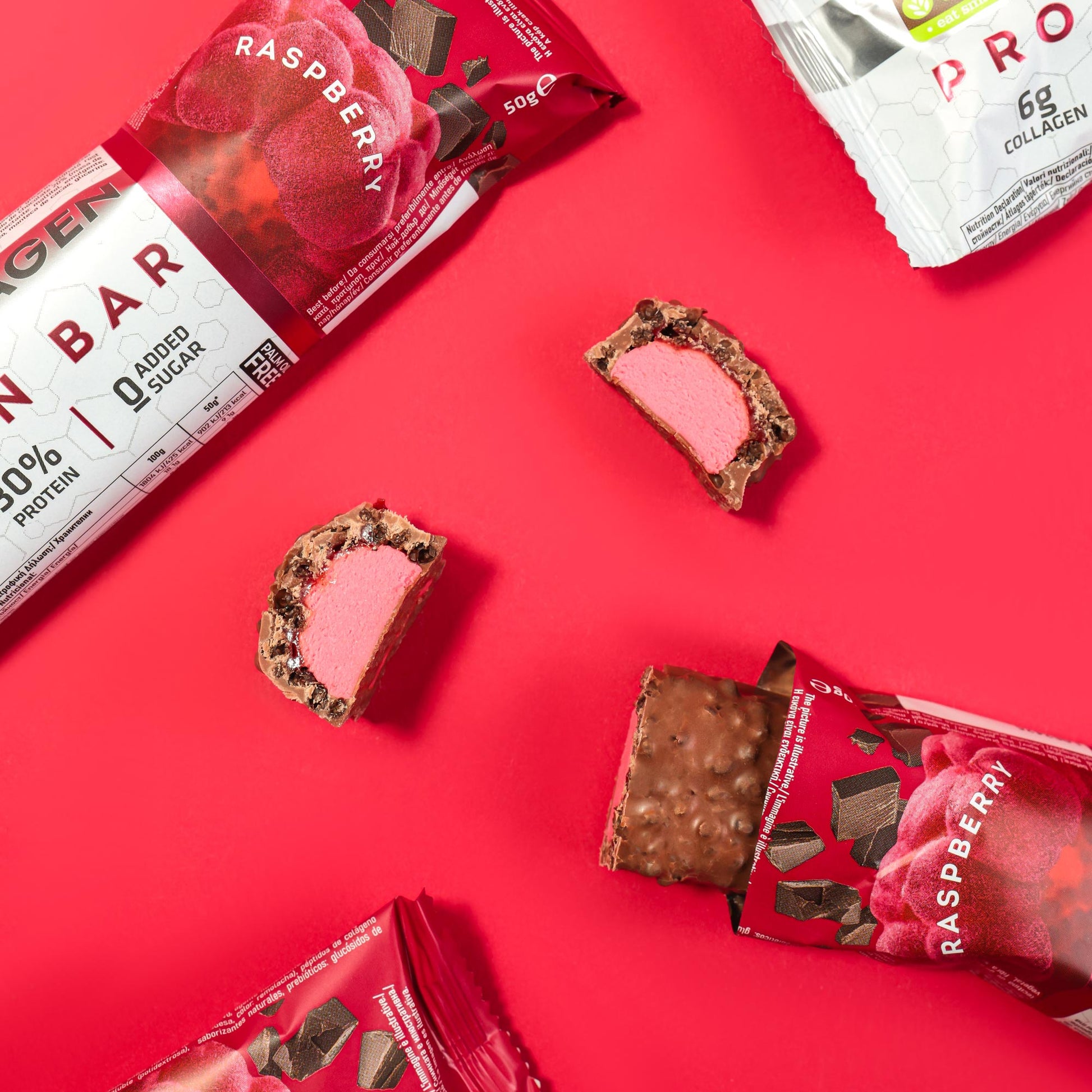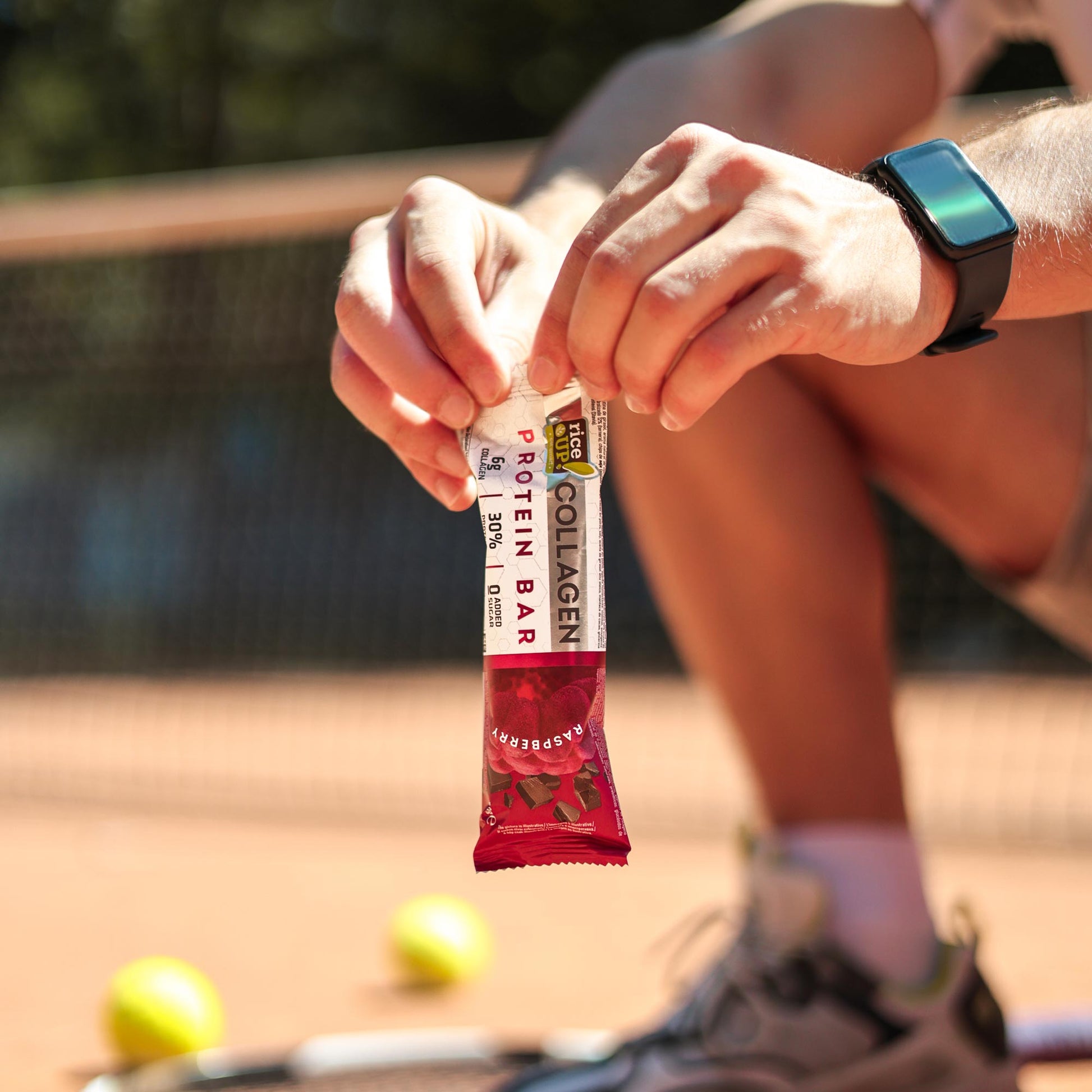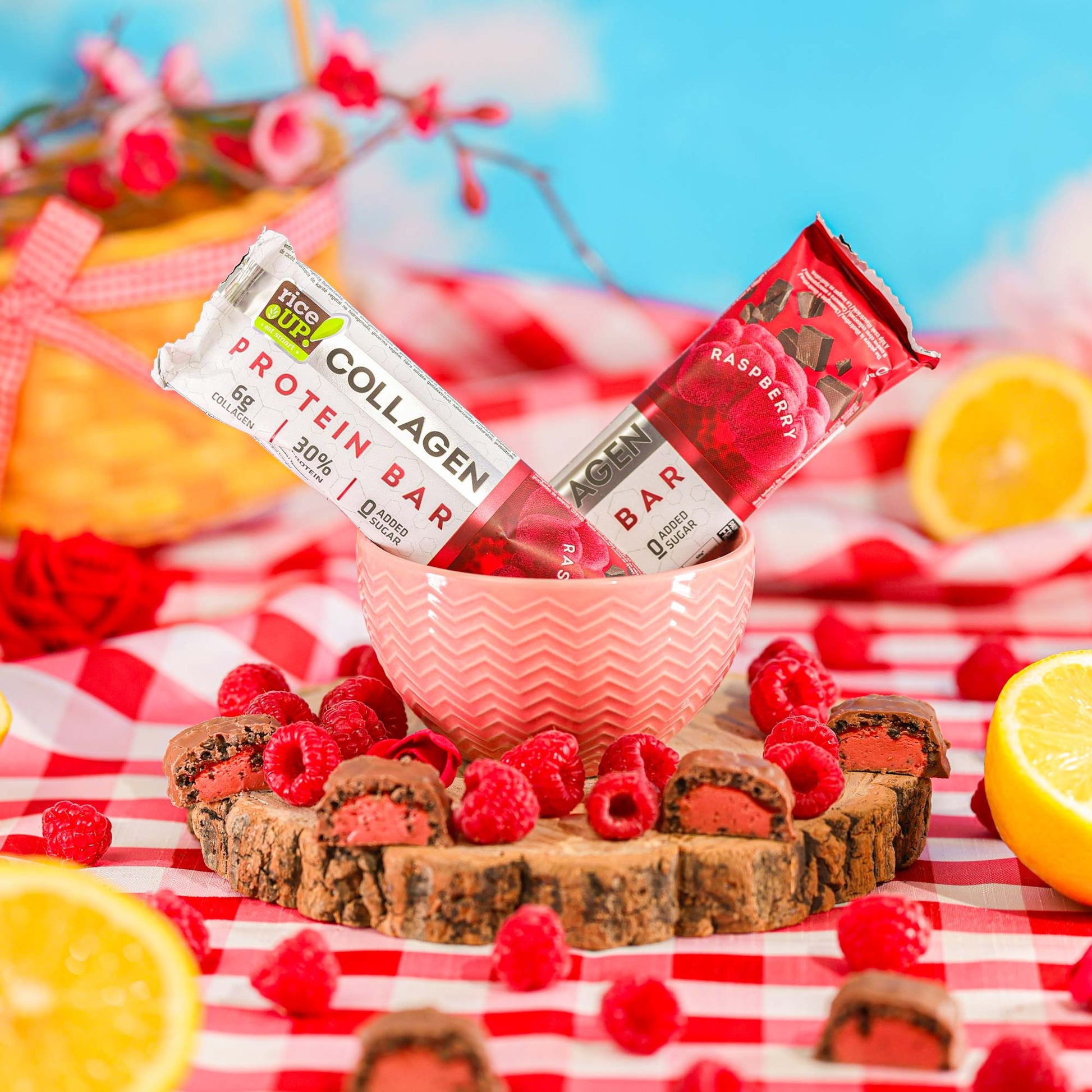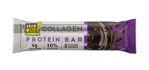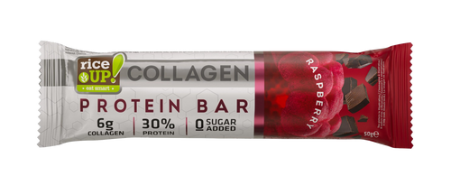 RiceUP! Колагенов бар е ново поколение функционален десерт, който не прави компромис с вкуса и се побира в под 215 калории, което го прави идеалният снакс за тези, които следят калорийния си прием, той една вълшебна комбинация от текстури, вкус и функционалност, която обещава наслада с всяка хапка! Съчетава нежен протеинов пълнеж с аромат на малина, слой малинов крем, без добавена захар и фини какаови криспита, обвити в истински млечен шоколад, без палмова мазнина. Колагеновият бар съдържа 6000mg хидролизиран телешки колаген тип I и III. Колагенът е ключовият компонент в RiceUP! Collagen Protein Bar.