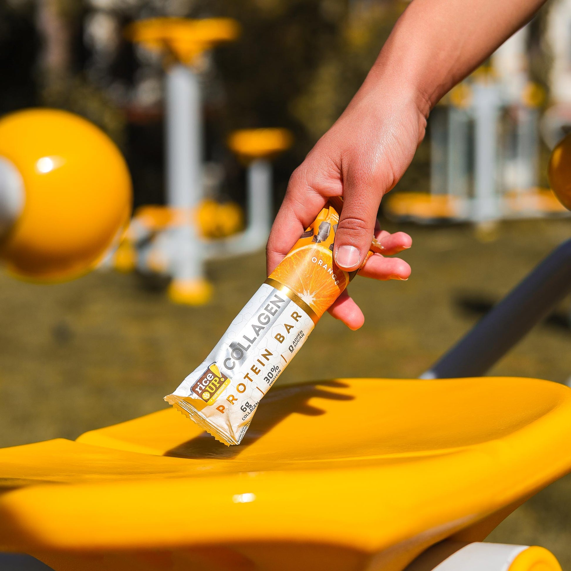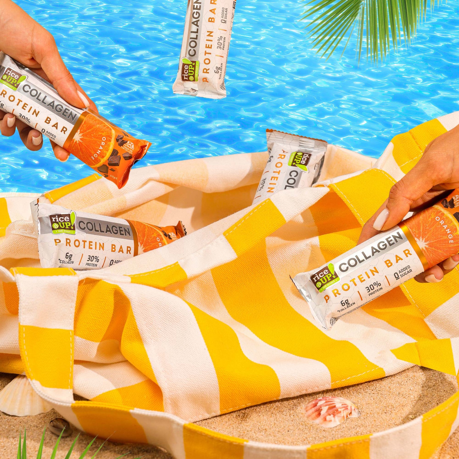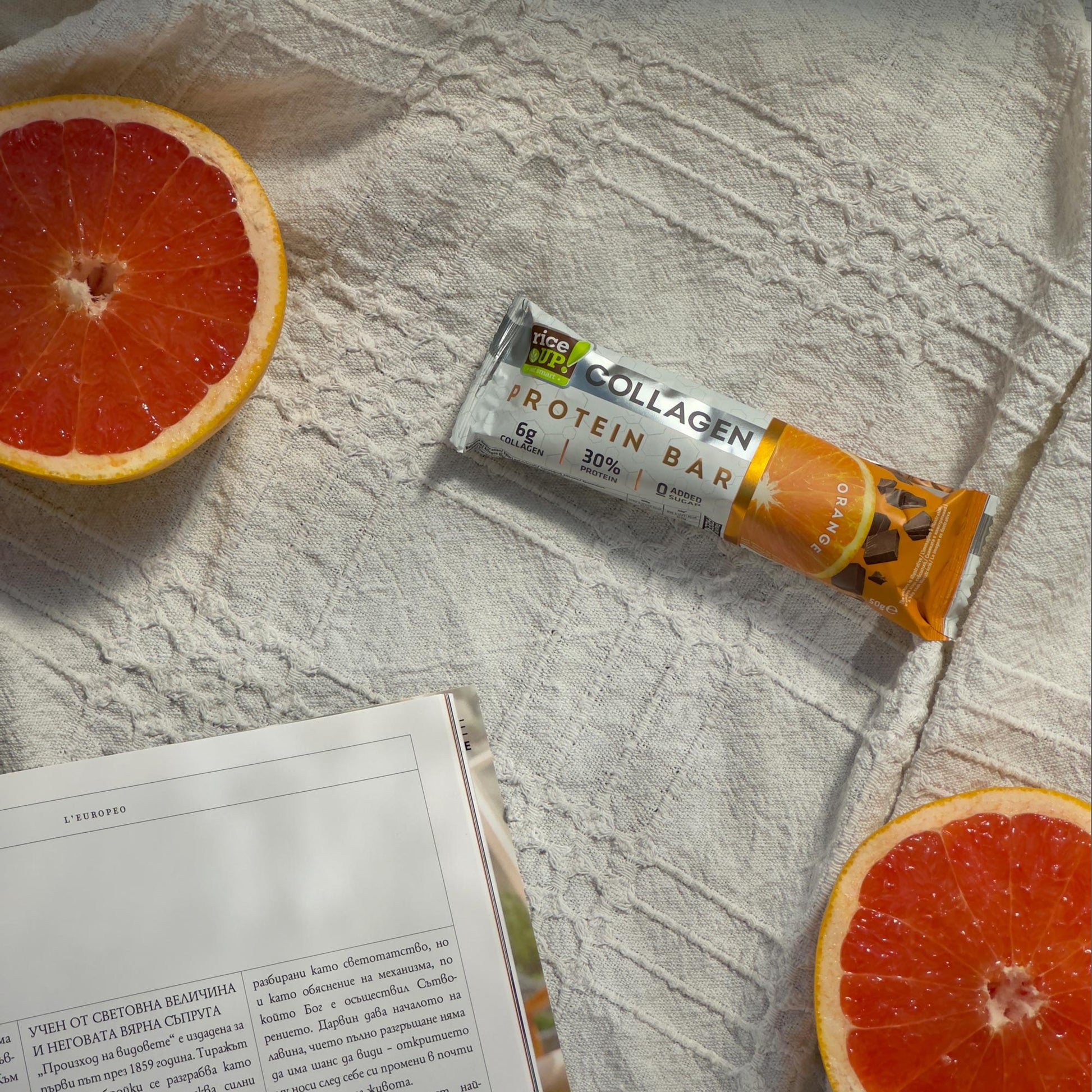 RiceUP! Колагенов бар е ново поколение функционален десерт, който не прави компромис с вкуса и се побира в под 215 калории, което го прави идеалният снакс за тези, които следят калорийния си прием, той една вълшебна комбинация от текстури, вкус и функционалност, която обещава наслада с всяка хапка! Съчетава нежен протеинов(млечен) пълнеж с аромат на портокал, слой свеж портокалов крем, без добавена захар и фини какаови криспита, обвити в истински млечен шоколад, без палмова мазнина. Колагеновият бар съдържа 6000mg хидролизиран телешки колаген тип I и III. Колагенът е ключовият компонент в RiceUP! Collagen Protein Bar.