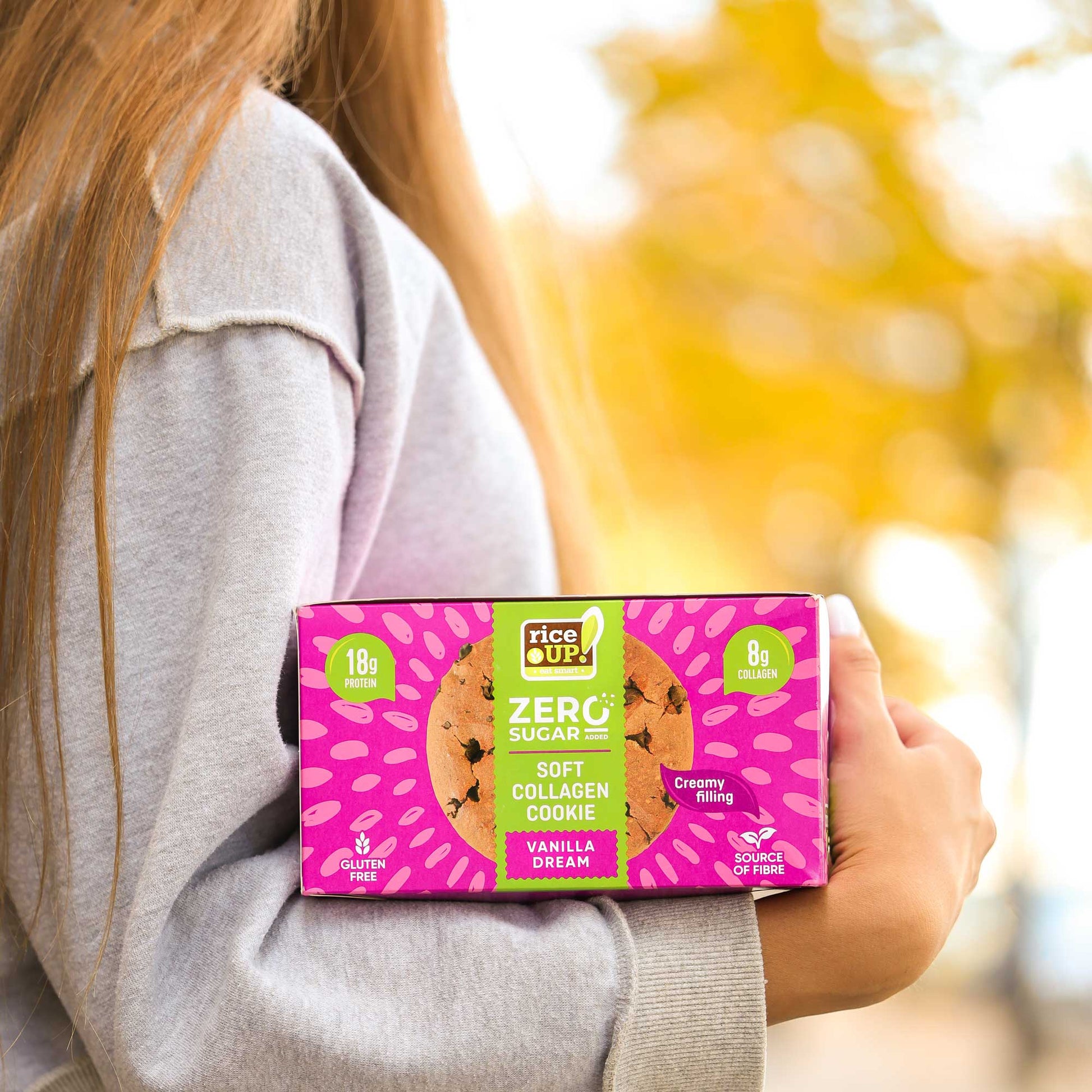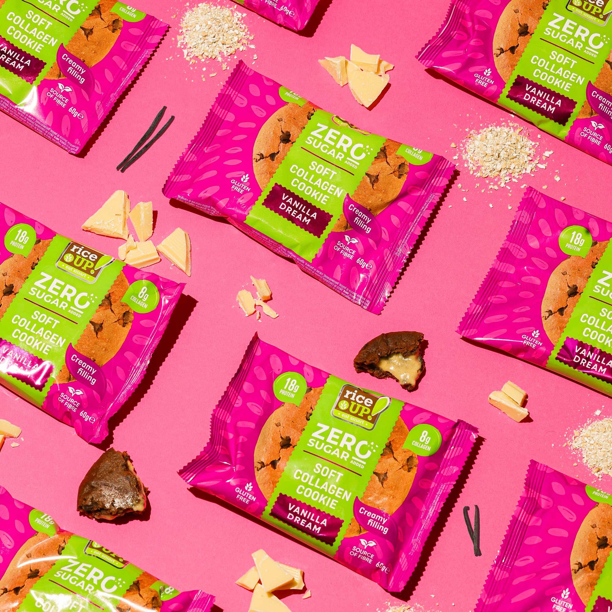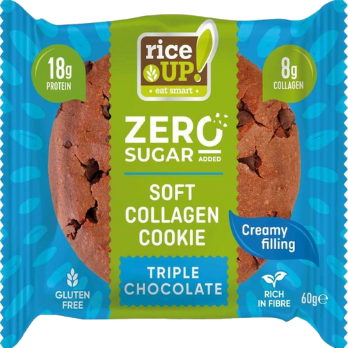 RiceUp! Kолагеново куки e революционен десерт от новото поколение функционални продукти, без компромис с вкуса. Съдържа в себе си под 240 калории – идеален за тези, които следят калорийния си прием. Приготвена изцяло от безглутенови овесени ядки, мека текстура с изобилие от шоколадови парченца и сърцевина от нежен ванилов пълнеж.